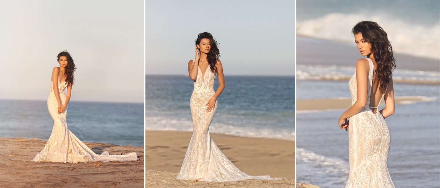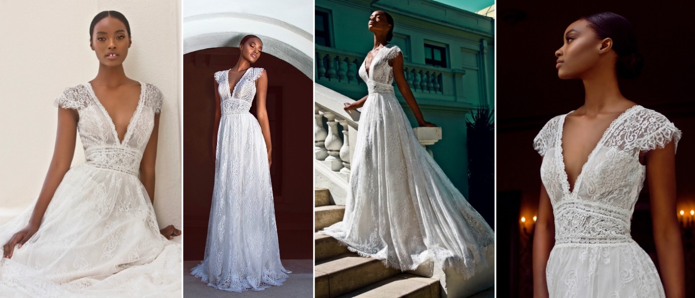 For brides-to-be who adore lace but want a modern style and like to show off a bit more skin, the Lillium gown features an exquisite plunging V-neckline and a delicate triangle back. A layer of soft and detailed Chantilly lace gives Lillium the illusion of being as light as air, making this gown perfect for summery boho-inspired weddings.