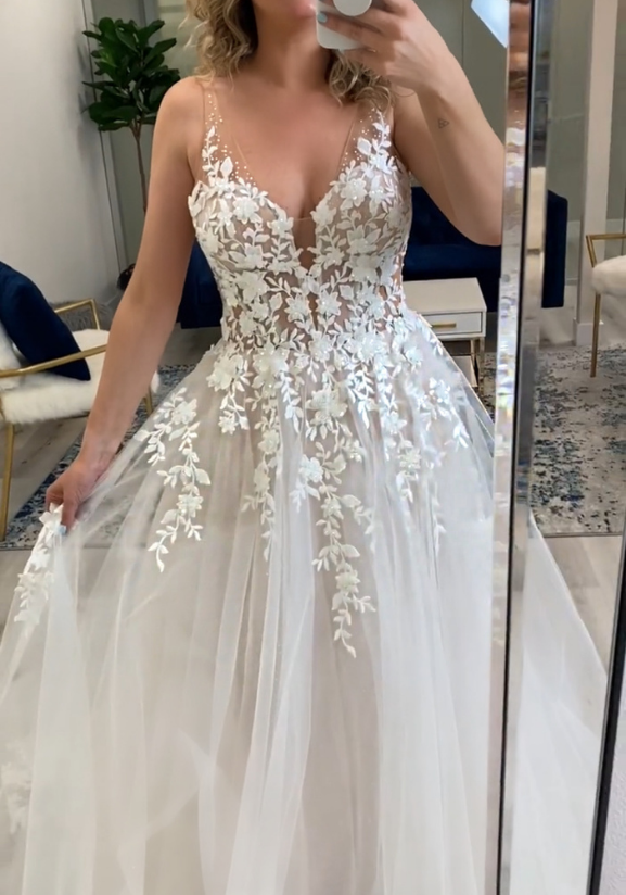 "OLANI is romance personified. This is a gorgeous lace and tulle A-Line. Obviously we are packing some ethereal, soft, romantic punches with this one. The lace on the bodice is a little bit chunkier, and it’s actually got fully beaded detail which is so gorgeous. It just really adds a twinkle, sparkle factor that’s just very subtle and very classy and not gaudy or over-the-top. You literally just kind of twinkle when you move, and same idea with these kind of floating straps where you’re like, is it a strap, what's going on? And the beading just kind of ombres up and just kind of dissipates. This is so ethereal and soft and romantic. I can see this at any sort of venue, but it definitely gives off that kind of sweet, outdoorsy vibe. I can see twinkle lights, I can see dusk... this is an absolute soft, romantic, while still being glamorous, gorgeous dress. I love the lace tapering down through the skirt and then kind of completely tapering off to where it's just all tulle. It’s very romantic. This is going to be a beautiful little number when you’re dancing. OLANI, girl, this is so romantic and beautiful."