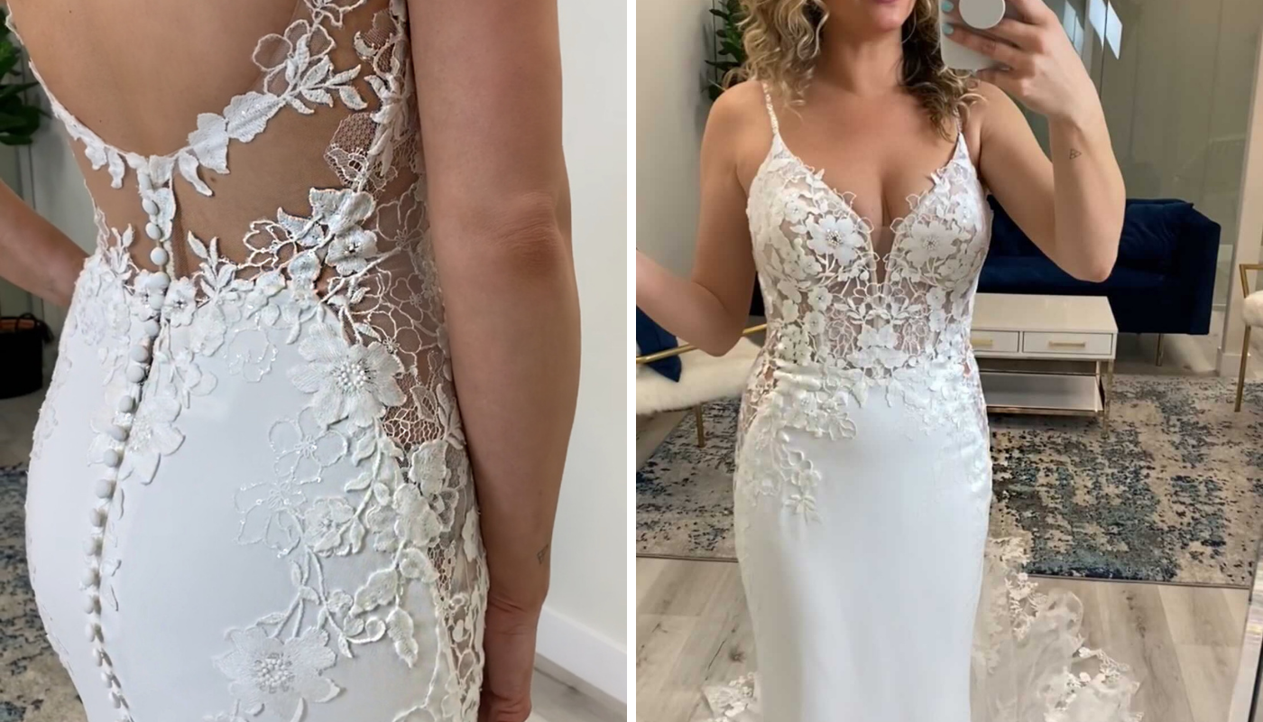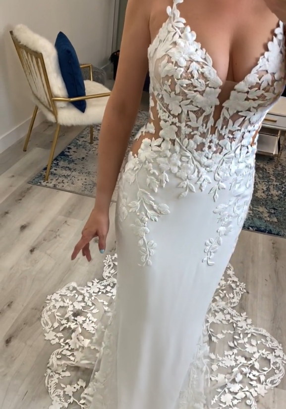 "OLIVIANA has stolen my heart. I absolutely adore this dress. It is just an incredible mix of that lace georgette. I love this kind of bulkier cotton lace just because I feel like it adds a little bit more texture. It is just a different vibe, it’s a different look than some of the other laces we see. There we have a little bit more of a classic flair to it. But, I really love it. It feels a little bit more informal, maybe? So if you’re going for more of a wedding that’s not super church, or not super sparkle glam, this would be a great way to incorporate that stretch georgette with a little bit of lace that’s going to have a little bit more of a modern feel. But, a little bit more of an earthy feel too. You again have our beautiful cut-outs which are just so flattering. They are just so sculpting to the body. A really plunging neckline with this one. We do actually have a little bit of a Chantilly lace layer underneath along with that sheer bodice so there’s just a lot of dimension on this bodice. The little straps have a little beading on. Again, that little sparkle right around the face. But, OLIVIANA, I love. I also love how the lace comes a little further down on the bodice. The stretch georgette is material that shows everything, so it's nice that you have a little bit extra coverage while still getting that still very clean, very chic, very sophisticated feel for the bottom. The train is insane. I’m going to show it to you. But, this is OLIVIANA. Beautiful!"