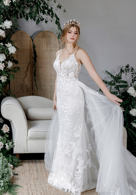 We think the two-in-one look could be popular in the future. In the 2021 collection, the 'Natsuko' gown with floral lace, a sweetheart neckline and the detachable off-the-shoulder straps is amazing. Or the 'Nicolina' gown with a detachable A-line train makes the mermaid silhouette even more WOW. The clever detachable details take the bride effortlessly from ceremony to reception and let her show two gorgeous looks on her one and only wedding day."