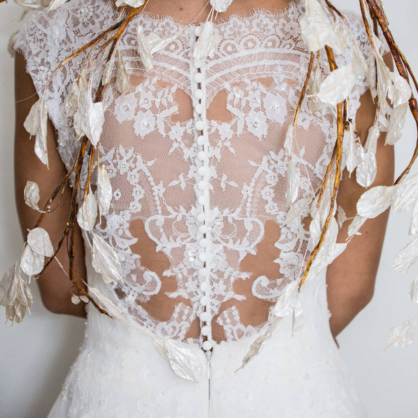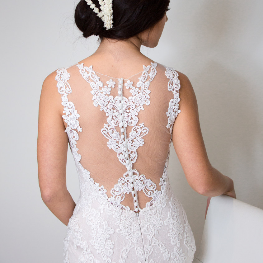 For a similar sweet illusion lace tattoo effect, style BT17-22 (pictured below) is a sleeveless stunner. A lovely mixture of Guipure and Chantilly lace creates the most unique look on the low illusion back with covered buttons.