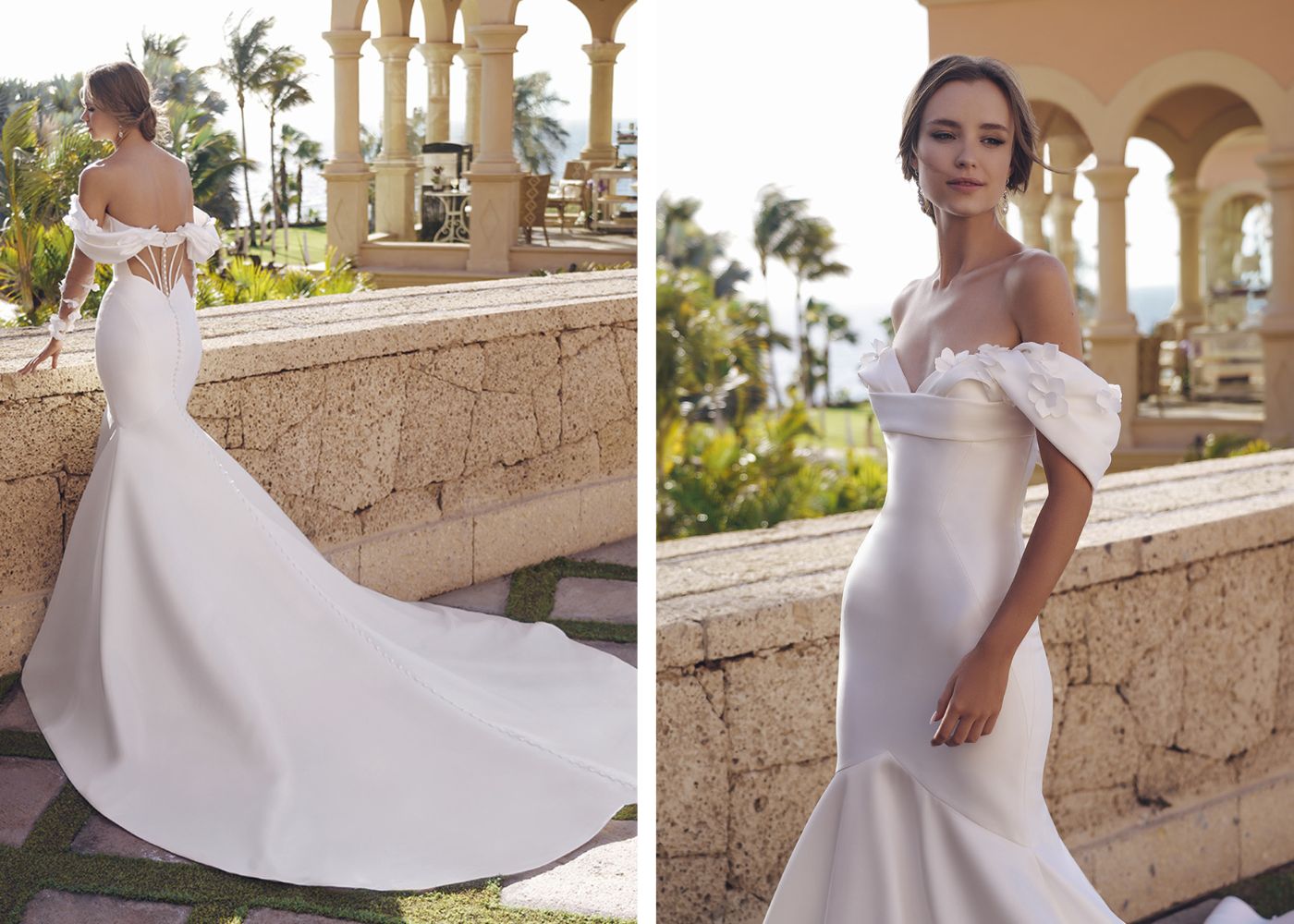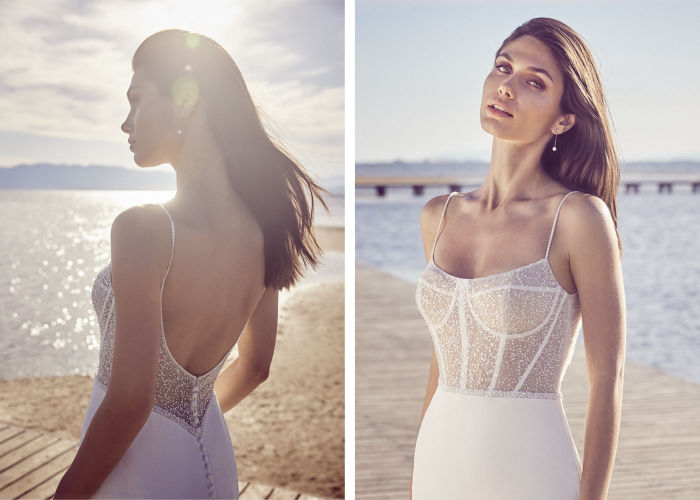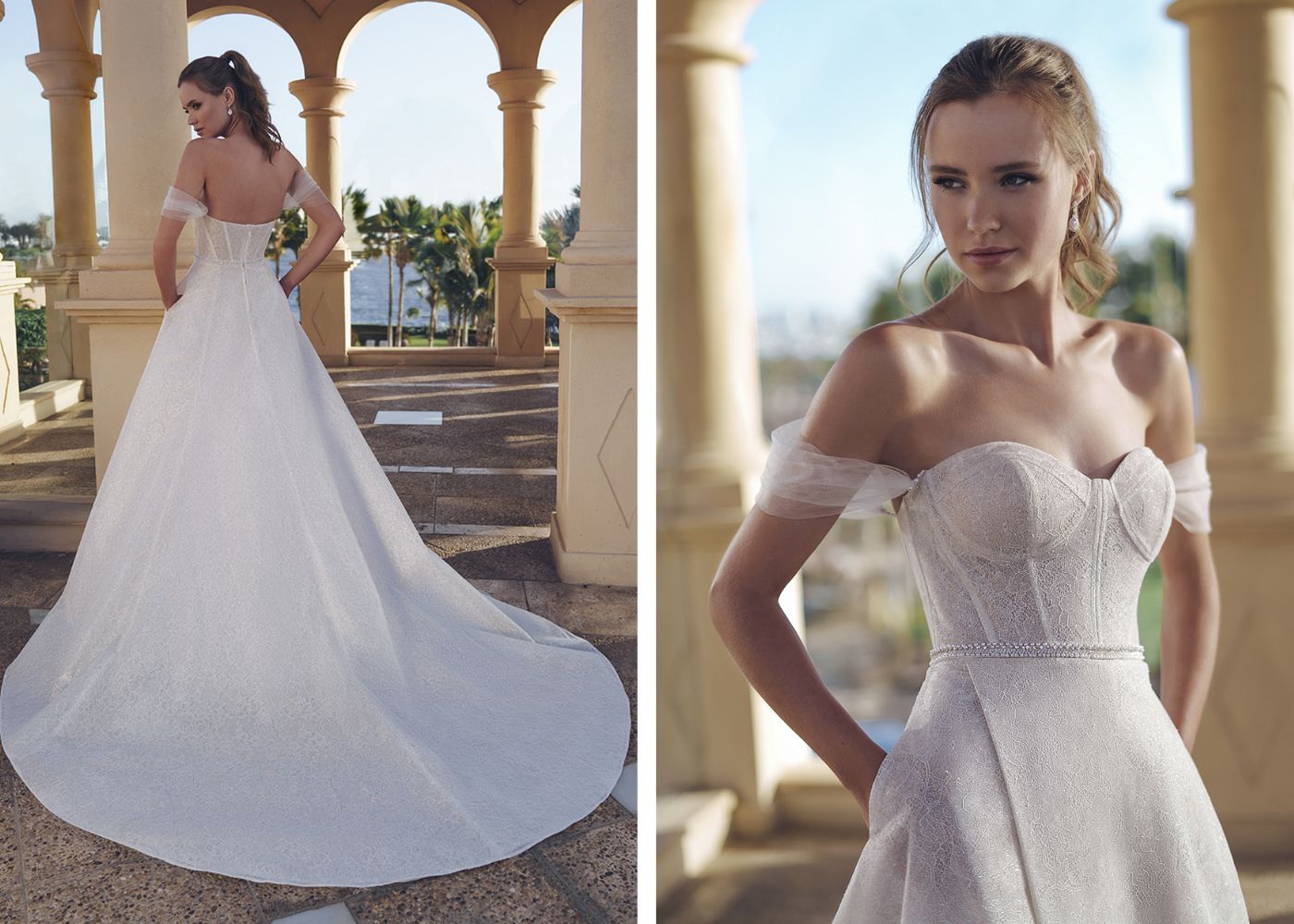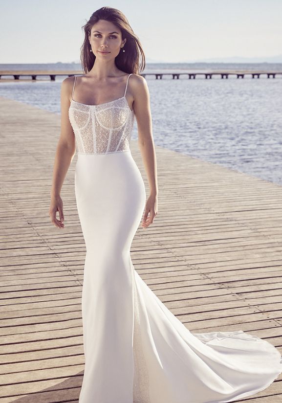 A beaded belt detail cinches the waistline while a front skirt slit adds an extra touch of sexy sophistication. The flattering sweetheart neckline and detachable, off-the-shoulder straps create a dreamy silhouette, while the shimmering fabric ensures you shine from every angle, making it a show-stopping choice for your walk down the aisle.
