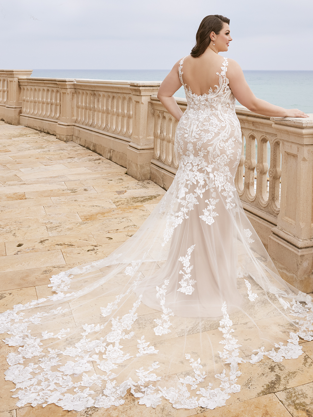 A sexy all-over lace column silhouette gown to bring the WOW factor to your wedding day! This ultra-romantic gown features exquisite floral lace thick straps supporting the sparkling baroque and floral lace bodice for a figure-flattering look. We also can’t take our eyes off of the captivating lace back that is chic, comfortable and supportive all in one…and that breathtaking sculpted illusion lace train!