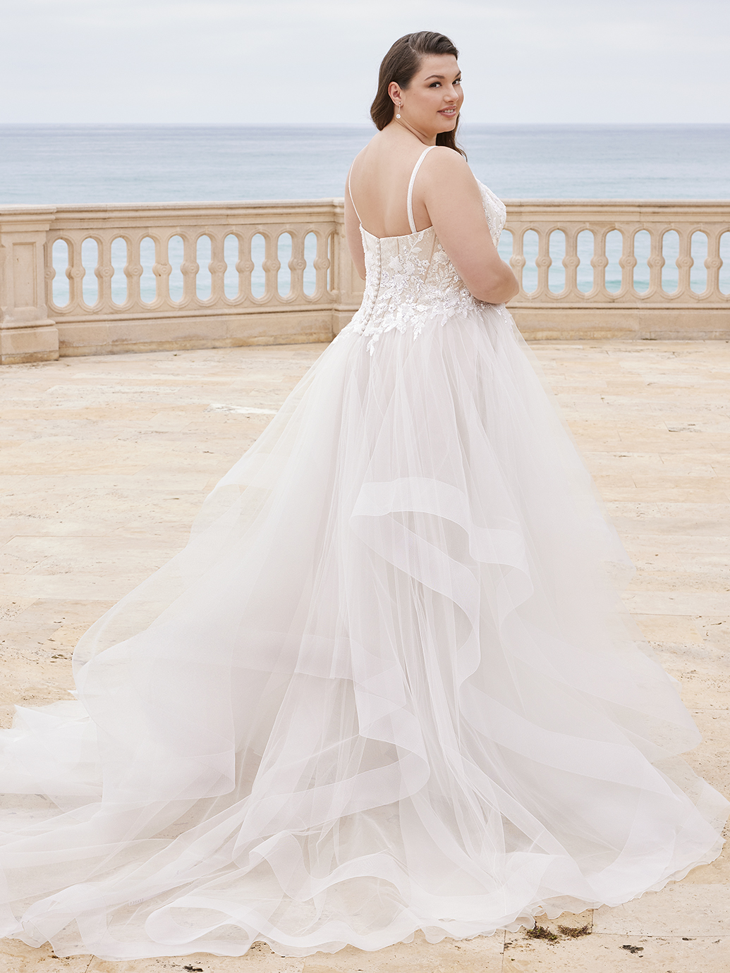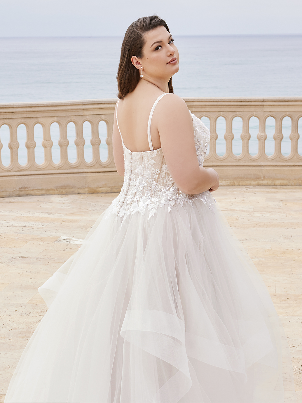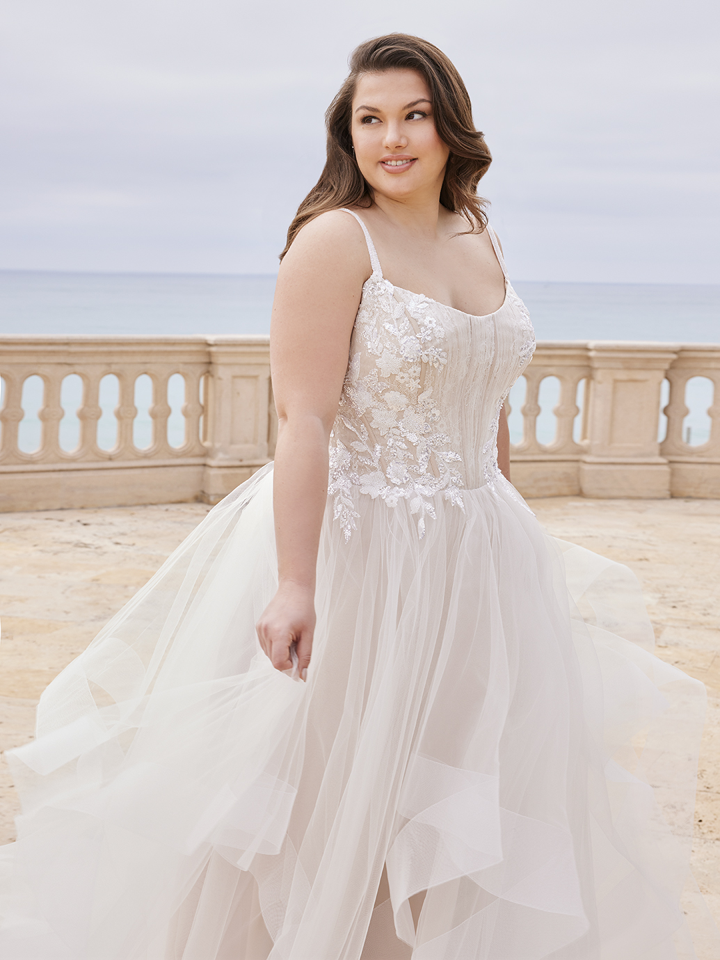For a fun and flirty look for your wedding day, SCHUYLER x Édition presents a gorgeous scoop neckline with intricate beaded thick straps on the shimmery Chantilly lace ruched tulle bodice and an eye-catching corset style back. The embellished floral lace accentuates the waist while perfectly complementing the dreamy, flirty ruffled tulle and organza skirt – perfect for dancing the night away on your special day.
