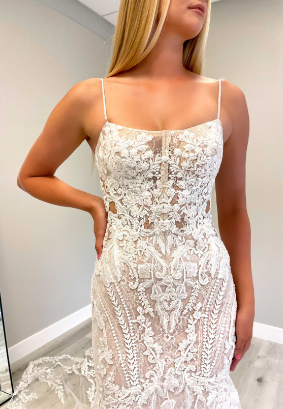This beautiful mermaid gown, ELIA, has a jaw-dropping V-neckline and body-contouring lace placement. The lace detailing all over the bodice and her tulle train will make everyone's heads turn!