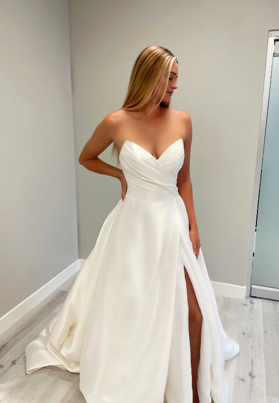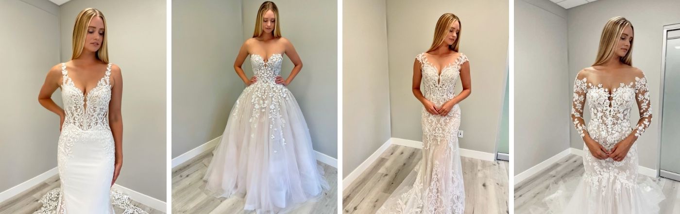 SIMONE is a guaranteed stunner as you walk down the aisle on your special day. She has an illusion, off-the-shoulder neckline that perfectly frames the deep sweetheart neckline.