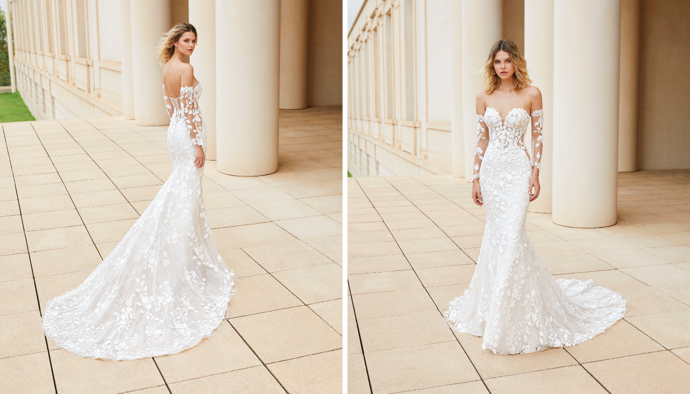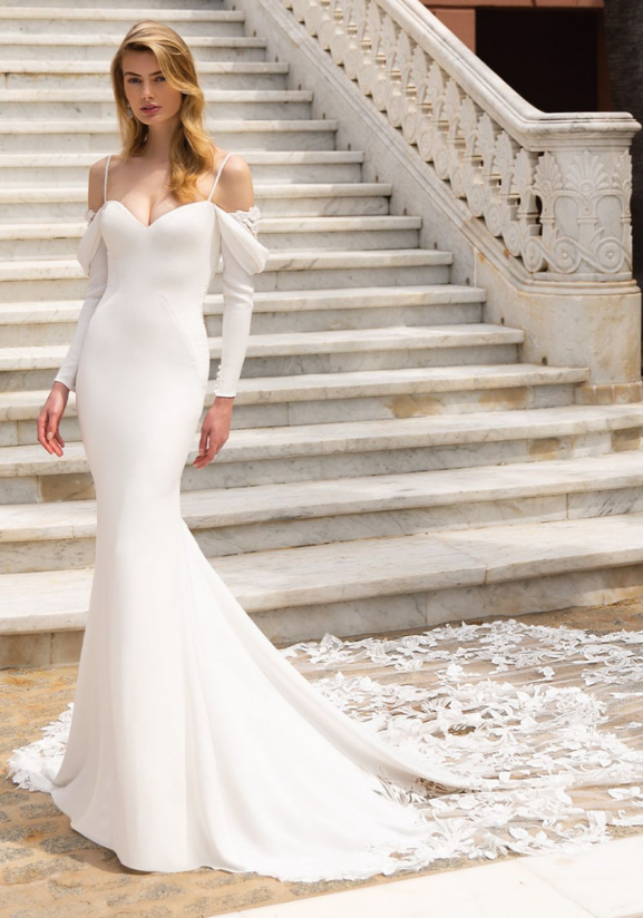 RONDA is a minimalist yet striking mermaid gown with stretch georgette for the most figure-flattering look. If you're searching for some extra oomph, RONDA comes with a removable scalloped train to complement the flowing embroidered lace back. This elegant extension will give you the statement back every bride wants down the aisle. Also add the detachable off-the-shoulder, draped fitted sleeves to add more to the sleek gown.