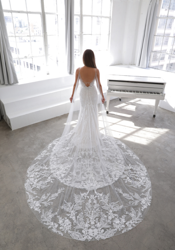 Make your big day even more magical with NEDA and her striking detachable cape and sexy side cut-outs. The sequin floral baroque lace blends with the tulle for a spectacular look. The stunning keyhole back also adds a magical illusion detail to the gown -- sure to leave your guests in an absolute trance.