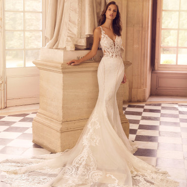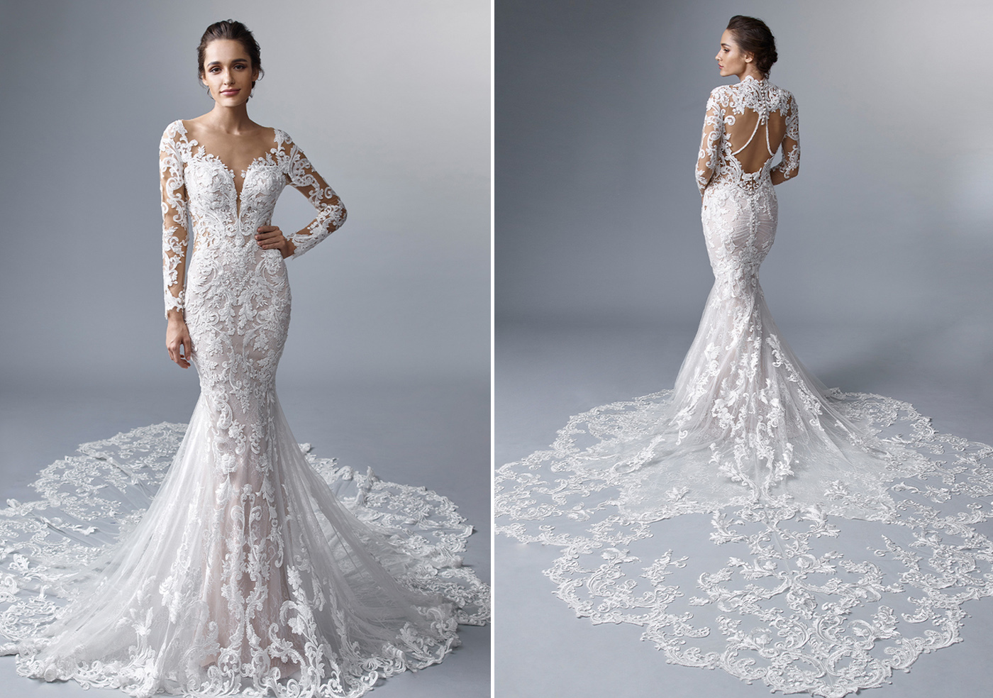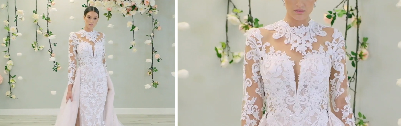 A plunging neckline isn’t for every bride on her wedding day. A high-neck gown brings new exciting options for brides looking for a stunning and sophisticated look, as well as being oh-so flattering. The Koh-I-Noor necklace is attached with elegant button detailing and blends seamlessly into the gown, transforming the modern classic into a sophisticated, glamorous second look. Perfect for the ceremony and with the option to remove it for a little more movement at the reception.