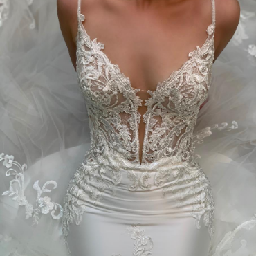 A full, flowing, detachable overskirt is the last piece to this magical puzzle. For all-out ethereal romance, this overskirt is perfect -- light and soft with beautiful hand-beaded, baroque lace appliques carefully placed around the waist and edge of the skirt. Even with all the gorgeous layers of tulle, the Koh-I-Noor skirt is surprisingly light and airy, perfect if you choose to keep it on during your reception or even for a romantic first dance.