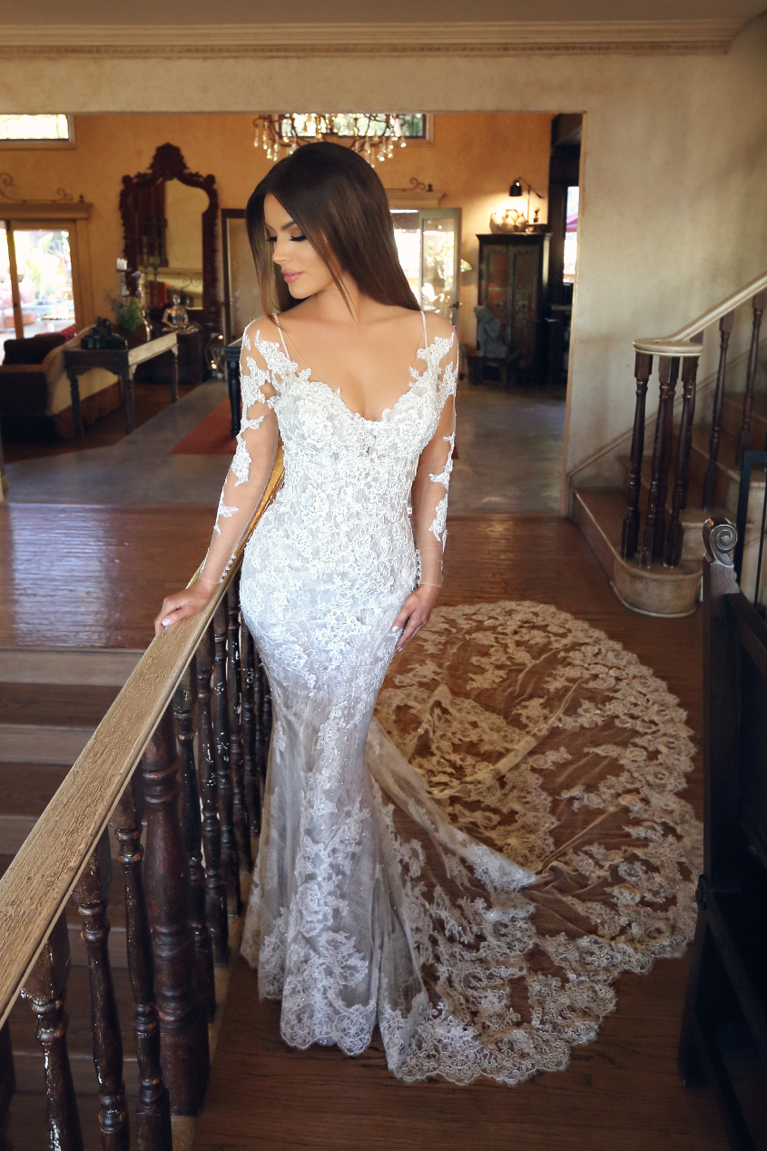 This gorgeous gown is sure to check off many brides' lists with its mermaid silhouette, floral long sleeves, and a deep open back. Be ready to walk down the aisle effortlessly in this gown.