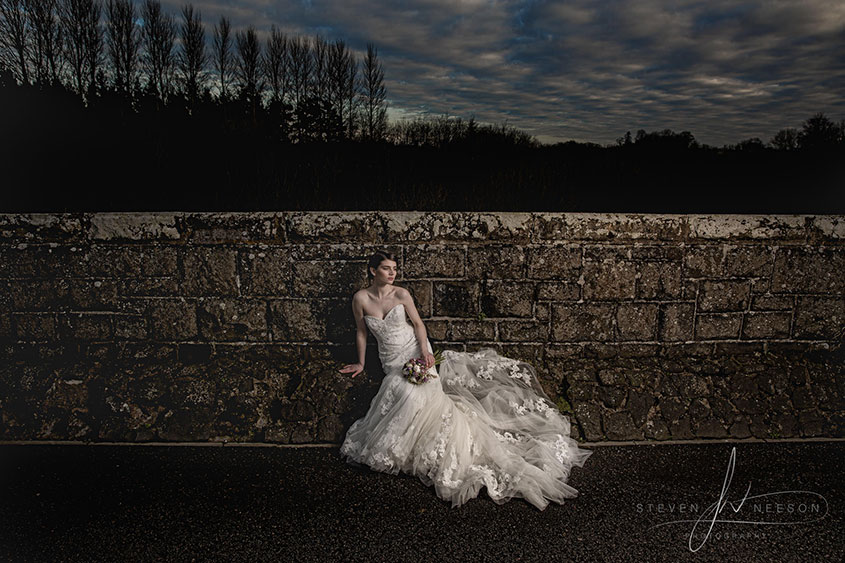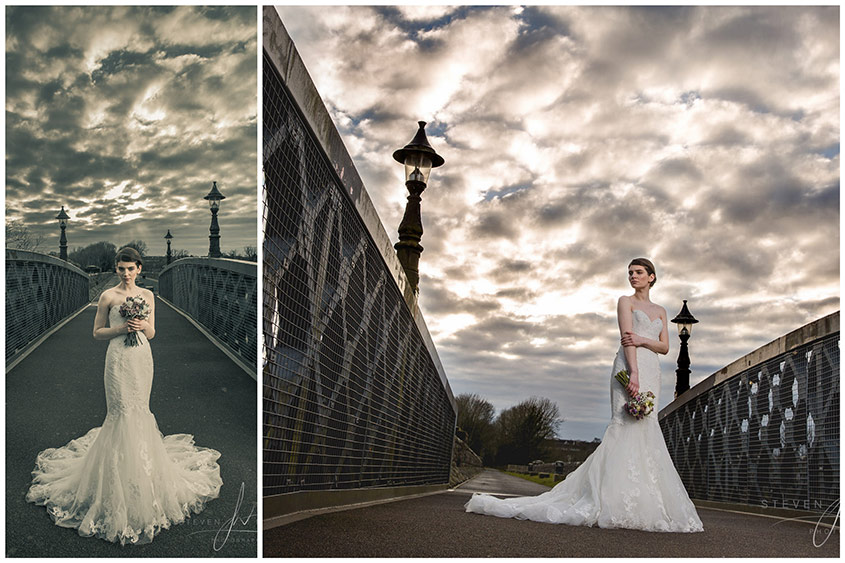 The bridge is such a beautiful place just a stone's throw from my studio. I left it later in the day as I wanted to catch the sunset. The sun was covered by thick cloud cover just as the sun began to drop, which initially disappointed me (we don’t get many sunsets in Northern Ireland), but it actually worked out great having the detail in the sky. I just wanted to show off the location in its beauty using the advantage of a beautiful bride. I was also trying to show the dress off in its glory and match it to the surroundings.